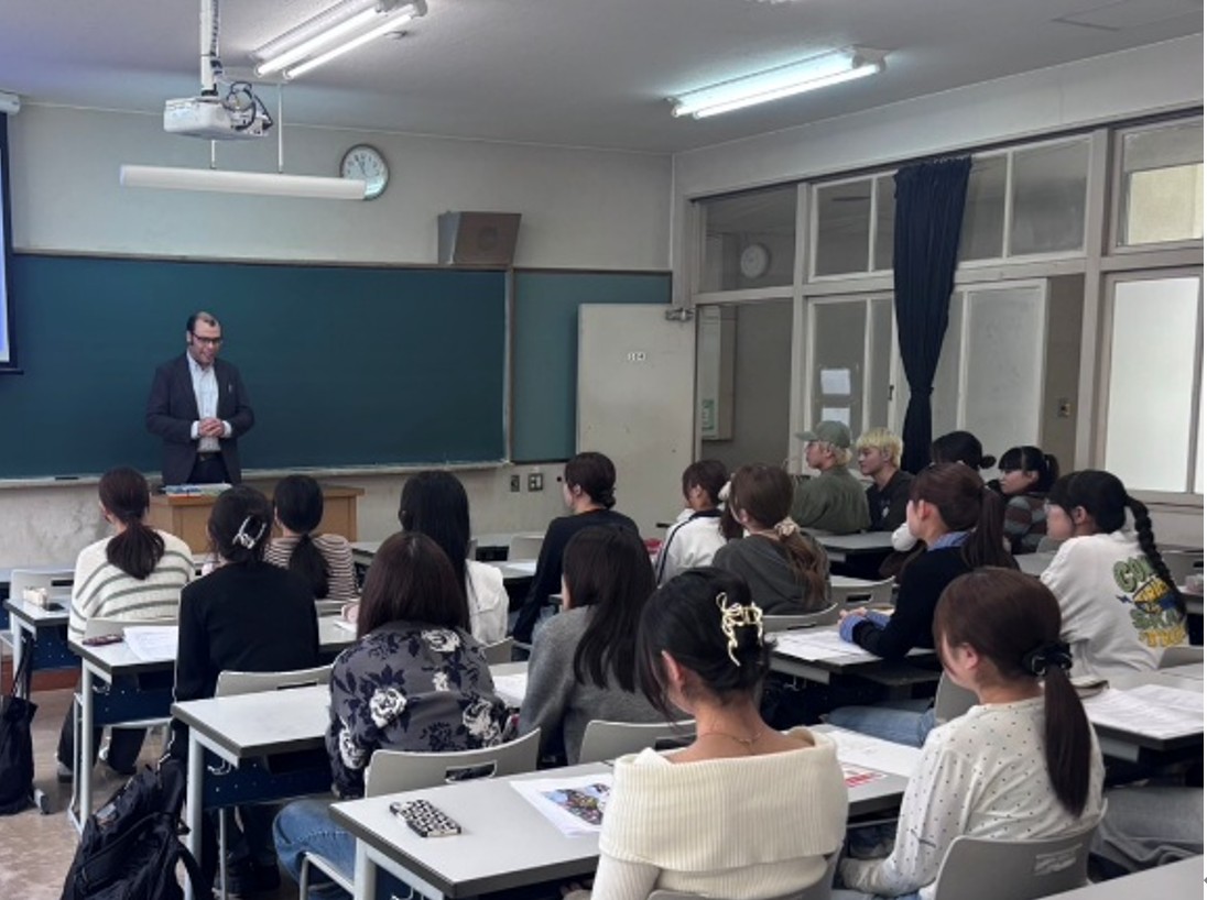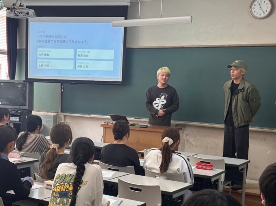 はじめに坂上国際交流委員長より本研修の意義についてお話があり、続いて後方支援の文学科・石井准教授がプログラムの概略を説明しました。その後、2024年度に参加した英語英文学専攻卒業生の大平樹音さんと石澤悠生さんが登壇し、ハワイの魅力や研修での学びと出会いを後輩たちに伝えてくれました。さらに昨年度の研修に参加した英語英文学専攻2年生の上野心瑚さんと飯田心羽さんが、ハワイ大学カピオラニ・コミュニティ・カレッジ(KCC)での授業や課外活動の様子をスライドと動画ともに紹介しました。最後に引率担当の文学科・ガルシア准教授が現地での2週間が一人ひとりの世界を広げる経験になることを語り、参加を呼びかけました。