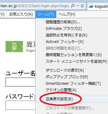 1. IE11で学生用ウェブメールにアクセスし, [ツール]→[互換性表示設定]