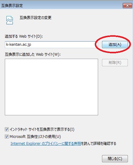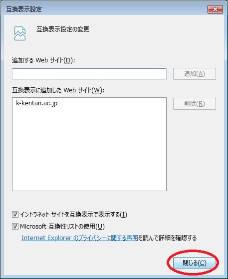 3.互換表示に追加したWebサイトに k-kentan.ac.jp が追加されていることを確認し,[閉じる]ボタンをクリック。